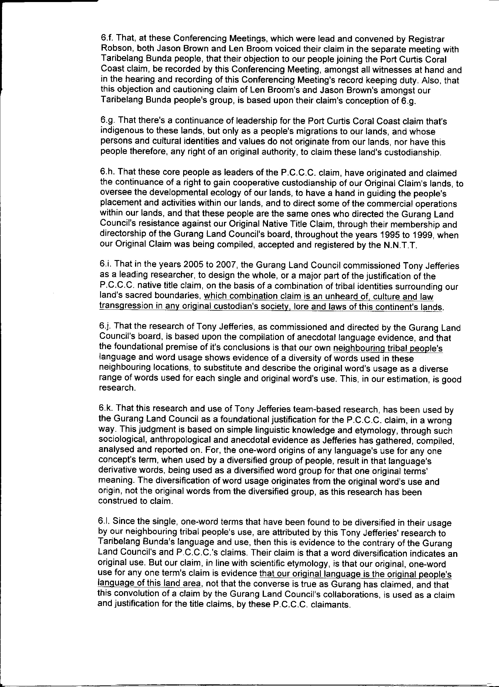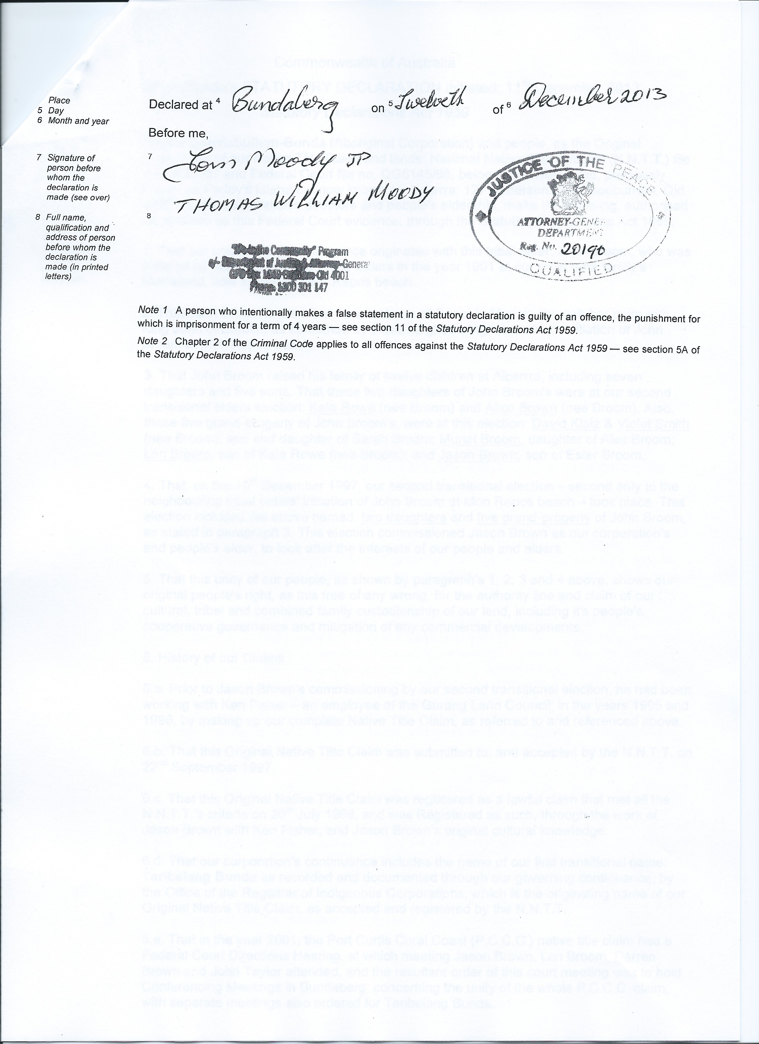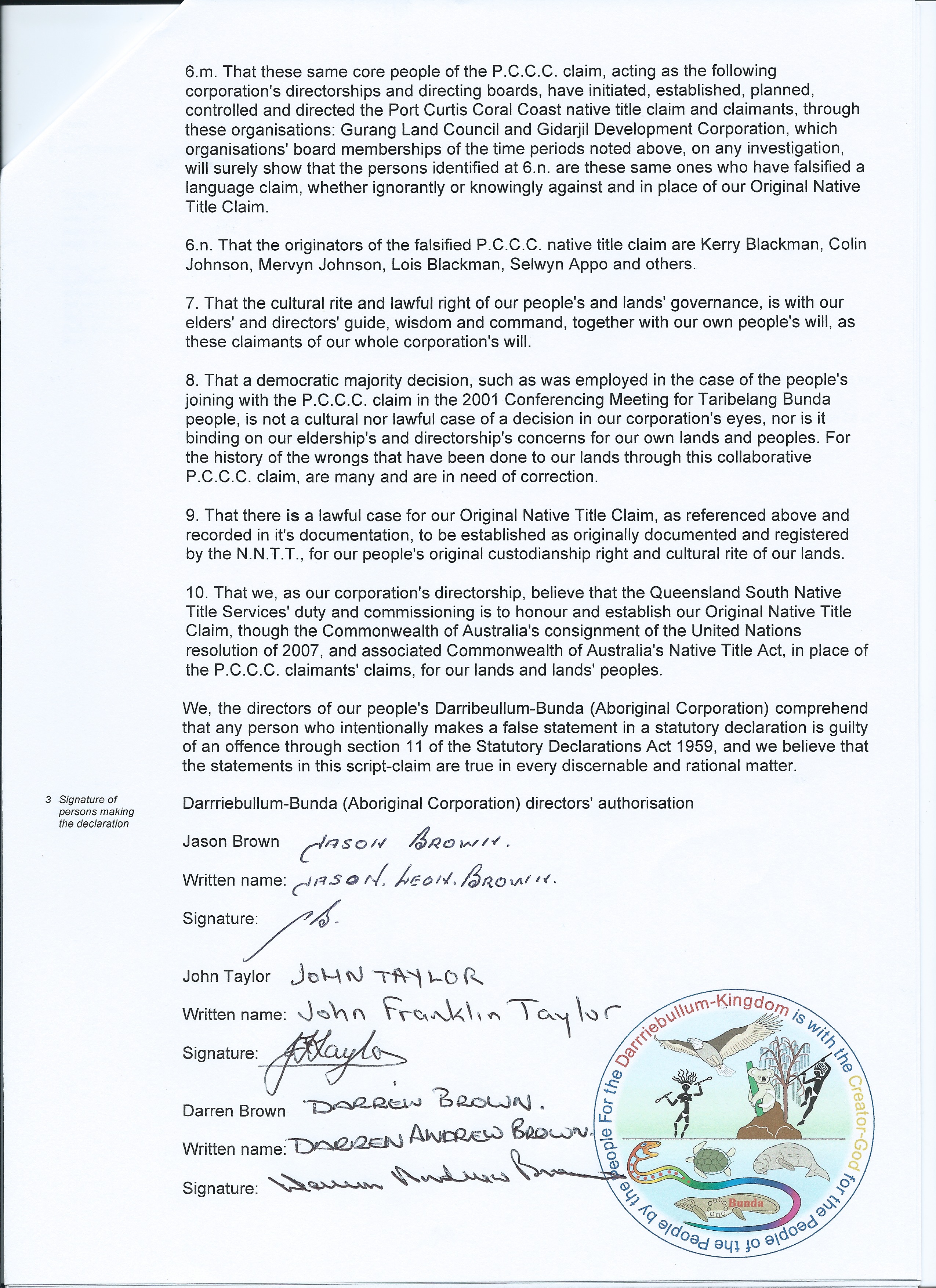 Our recent attendance at the Federal Court hearing on Feb. 13th 2013, for the Port Curtis Coral Coast claim, resulted in us giving this Statutory Declaration to one lawyer of the Queensland South Native Title Services (Q.S.N.T.S.): Paul Richards; and to one barrister of a Sydney law firm: Tony McAvoy.