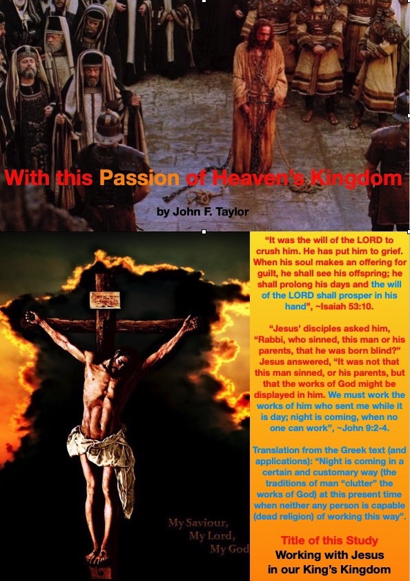 Working with Jesus in our King’s Kingdom is a thorough-going appraisal of ~Matthew 11:12, viz: “…from the days of John the Baptist until now the kingdom of heaven suffers violence, and the violent take it by force…”, New King James Version, with “proof-parsing” of the Greek text for that verse.