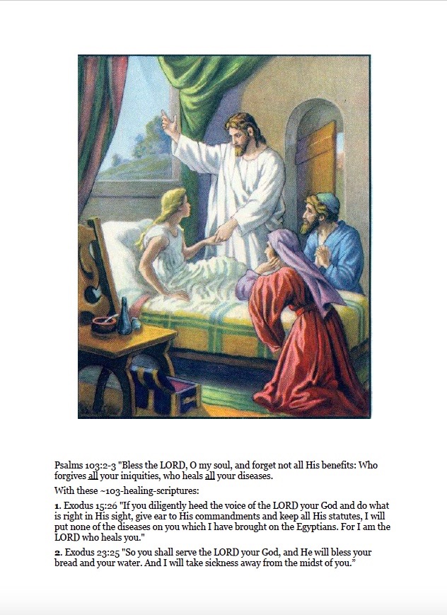 Healing Scriptures is the compilation of 103 scriptures from throughout the Holy Bible, based upon this scripture: “”Bless the LORD, O my soul, and forget not all His benefits: Who forgives all your iniquities, who heals all your diseases” ~Psalm 103:2-3. Isn’t it neat that Holy Spirit speaks to us in these ways: Psalm 103 as the original claim and 103 cites in scripture follow, which teach us about how God heals us: Woo Hoo! I’ve had healing from confessing these scriptures and I’ve heard of others who have too: one from cancer.