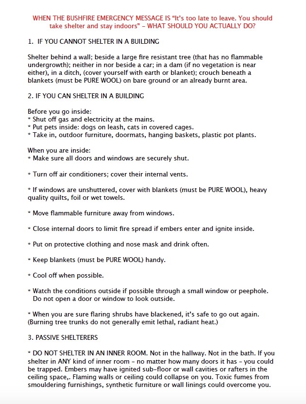 Fire Threat Procedure is a 2-page document, produced by our nation’s/Australia’s Commonwealth Scientific and Industrial Research Organisation (CSIRO) in 2012. It provides instructions for what to do in case of an approaching fire-front when the radio message for your land location is “It’s too late to leave. You should