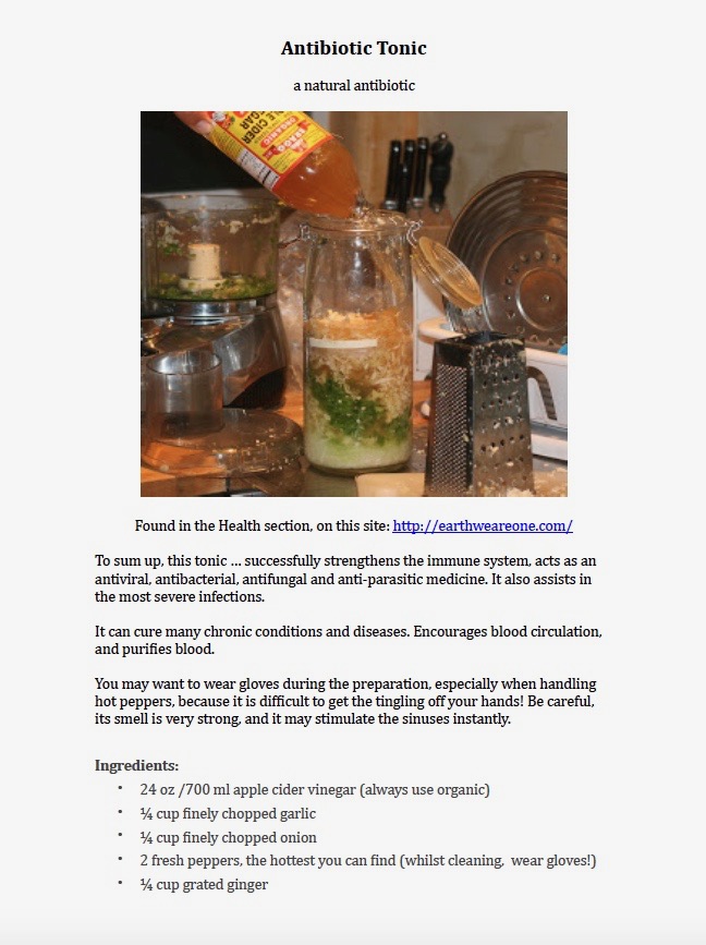 This Antibiotic Tonic is a home remedy for the prevention, suppression and eventual or hopeful cure of colds and flus. This document provides the recipe and some advice on its use as an immune system sustainer and upgrader.
